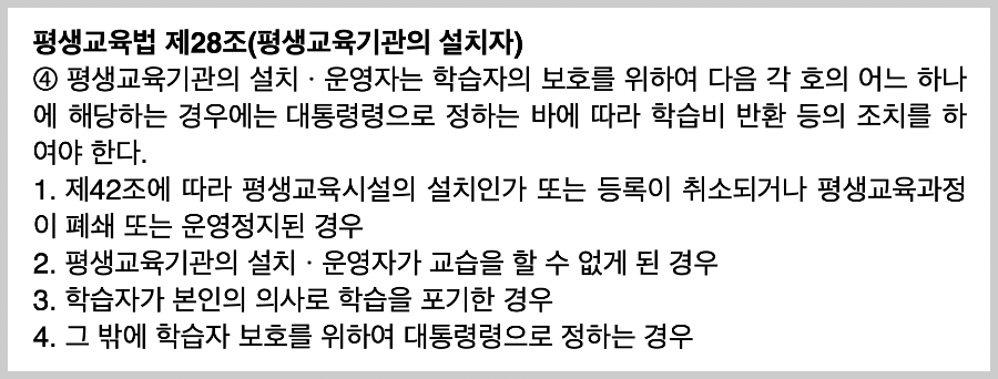 - 법 제28조 제4항 제2호 : 평생교육기관의 설치ㆍ운영자가 교습을 할 수 없게 된 경우