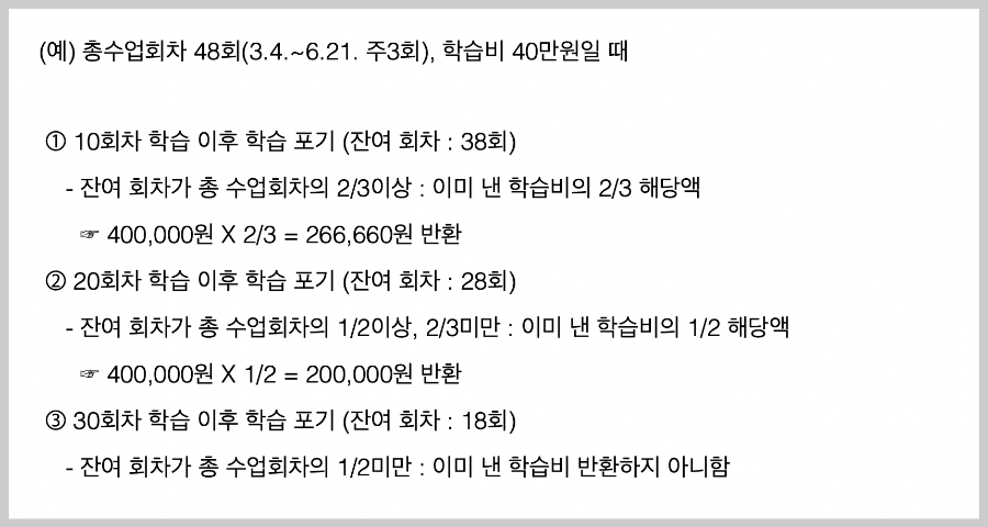 - 잔여회차가 총 수업회차의 2/3 이상인 경우 : 이미 낸 학습비의 2/3 해당액
