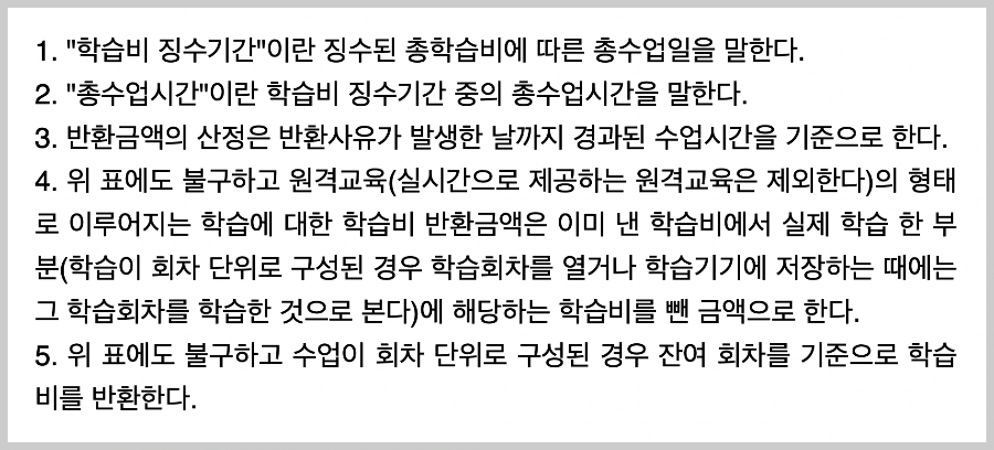 즉, 비고 4번에서는 위의 학습비 반환기준에도 불구하고 원격교육(동영상 강의)에 대한 학습비 반환은 해당 동영상을 보거나(해당 학습회차를 열거나), 학습기기에 저장하는 때에는 그 학습회차를 본 것으로 간주하고 있으며 이를 뺀 나머지 부분을 반환금액으로 한다고 되어있습니다.