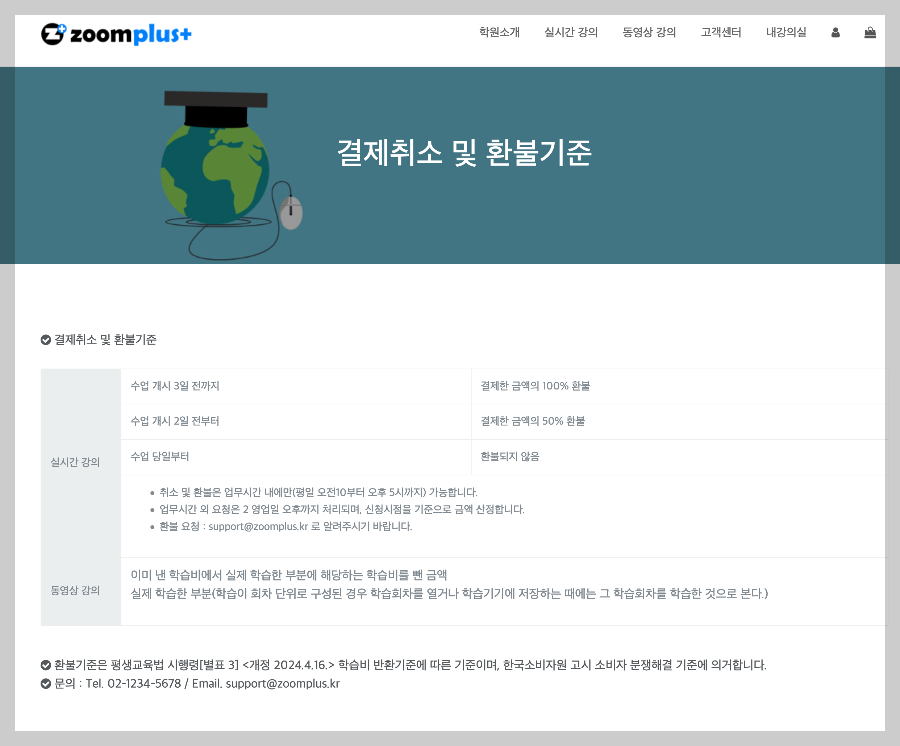 학습비 반환기준에 대한 위 교육부시행령 별표 3의 내용은 줌플러스 원격학원 솔루션에도 반영하였습니다. 따라서, 솔루션을 사용하실 때 전화번호와 이메일 부분만 수정하셔서 사용하시면 되겠습니다.