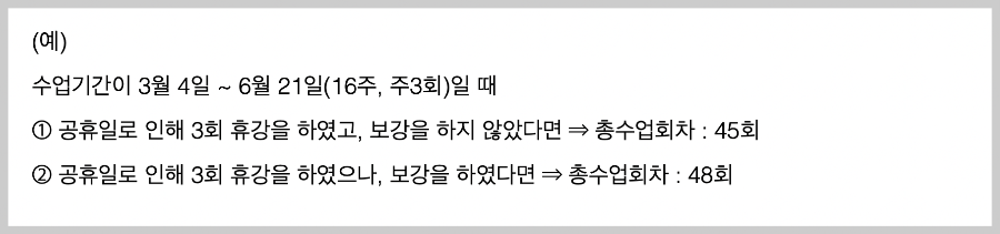 수업이 주 1회·주 3회 등으로 구성되거나, ‘10회 차’ 과정 등으로 구성되어, 총 수업회차를 기준으로 학습비를 납부하게 되는 경우를 말합니다. 이때 공휴일 등으로 인해 휴강하는 경우는 총 수업회차에서 해당 회차만큼 제외하고, 보강이 이루어지는 경우는 총 수업회차에 해당 회차를 포함시킵니다.